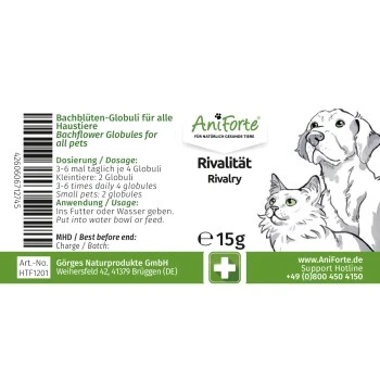 AniForte Bachblüten Rivalität ist eine spezielle Bachblüten-Kombination für Haustiere mit aggressivem Verhalten gegenüber Artgenossen. Die rein pflanzlichen Globuli unterstützen die Tiere bei Aggressivität, Stress und Unruhe.