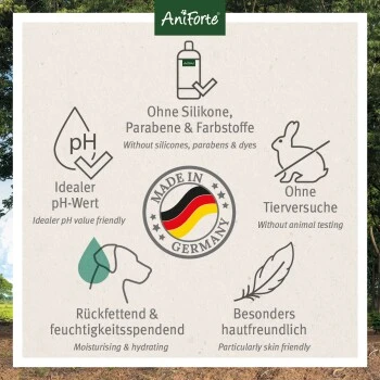 AniForte Neemöl Shampoo ist hautfreundlich und angenehm im Geruch. Dank seiner rückfettenden Eigenschaft ist es gleichzeitig eine hervorragende feuchtigkeitsspendende Pflege für die Haut Deines Lieblings – außerdem lässt es das Fell in neuem Glanz erscheinen. Durch die wertvollen Inhaltsstoffen ist das Fell leichter kämmbar. Das enthaltende Neemöl ist ein traditionelles indisches Heilmittel und wird aus den Samen des Neembaumes gewonnen. Das Teebaumöl unterstützt Deinen Vierbeiner bei Juckreiz.