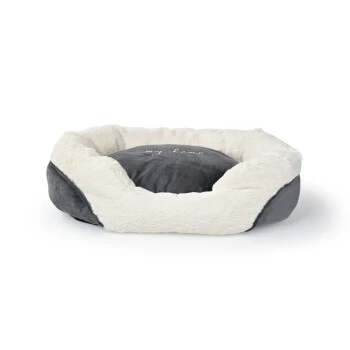 Durch die mit grauem Kurzhaar-Plüschstoff überzogene Außenseite und eine Kissenseite wirkt das Bett elegant und zeitlos. Die graue Kissenseite ist zudem mit dem gestickten Schriftzug „my home“ veredelt. Die Bettinnenseite und die zweite Kissenseite sind mit einem flauschigen, hellen Plüschstoff überzogen, sodass der Liegeplatz zu einem gemütlichen Erholungsort für deinen kleinen Vierbeiner macht.