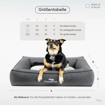 Das orthopädische Hundebett ist mit atmungsaktiven & druckentlastenden Memory Foam Flocken gefüllt. Der pflegeleichte Bezug des Hundesofa ist abnehmbar und kann bequem bei 30 gewaschen werden. Dein Hundebett wird liebevoll in Handarbeit in der EU produziert. Die drei Größen passen ideal für kleine, mittelgroße und große Hunde.