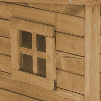 Die Fenster aus Plexiglas sorgen für einen Überblick Ihrer Katze und Licht im Inneren. Das Haus ist bereits mit Holzschutzfarbe lasiert und somit vor jeglichen Witterungseinflüssen geschützt. Die höhenverstellbaren Kunststofffüße schützen vor Bodenkälte.
