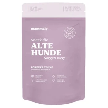 FOREVER YOUNG stärkt bei regelmäßiger Gabe mit vielen aktiven Zutaten die Vitalität und Lebensfreude älterer Hunde.